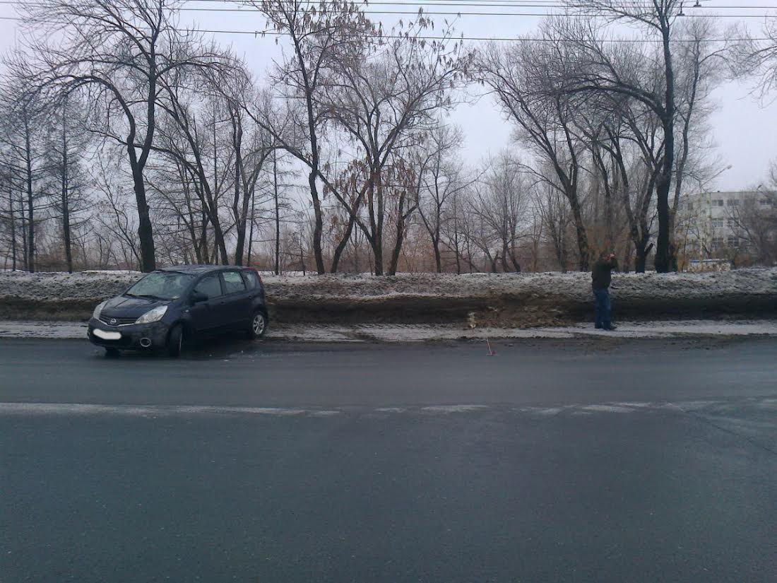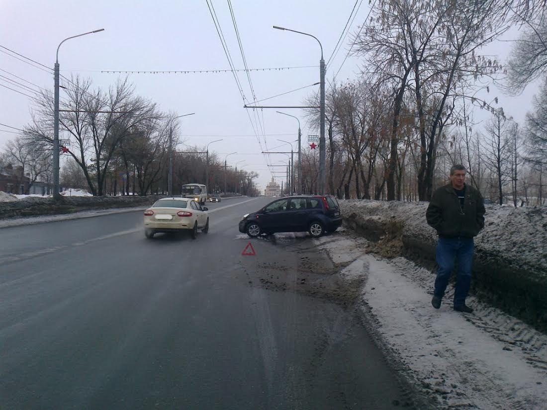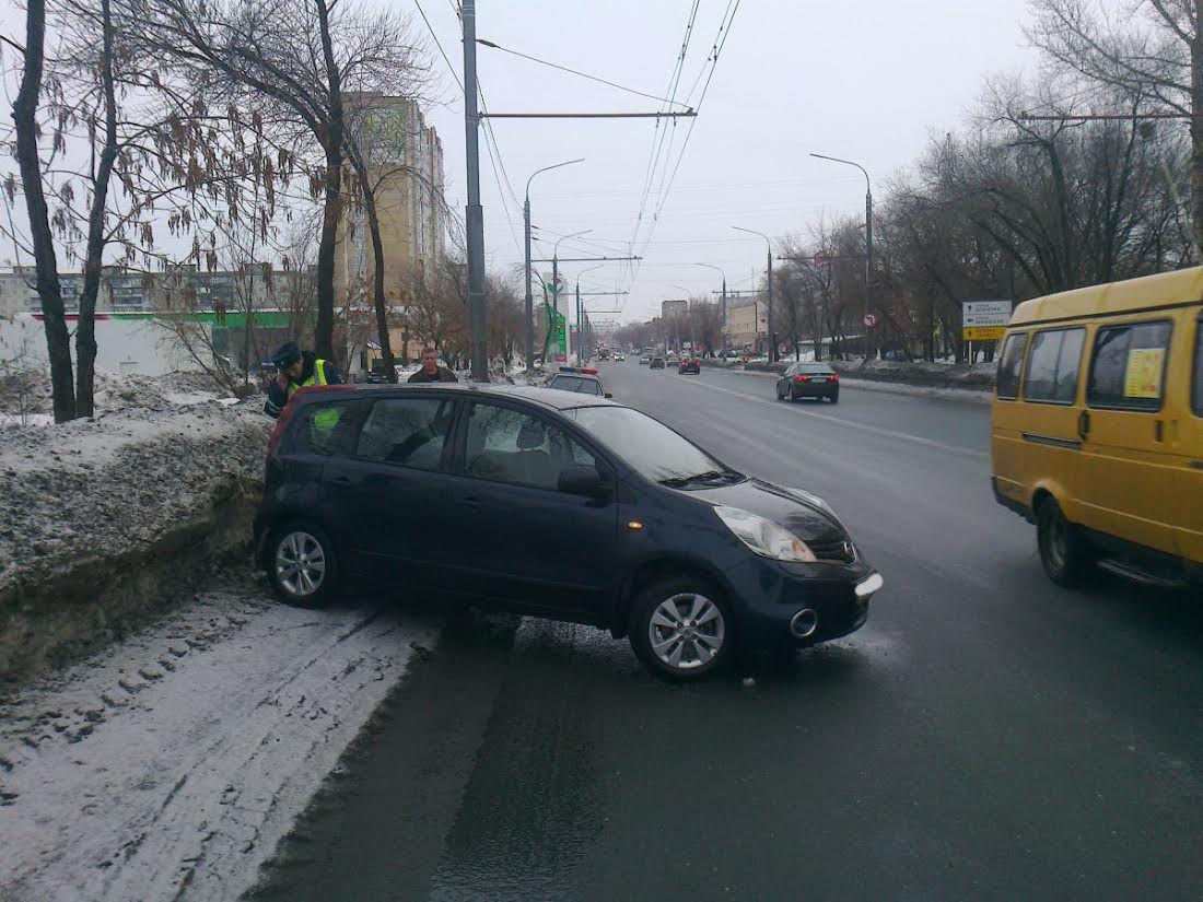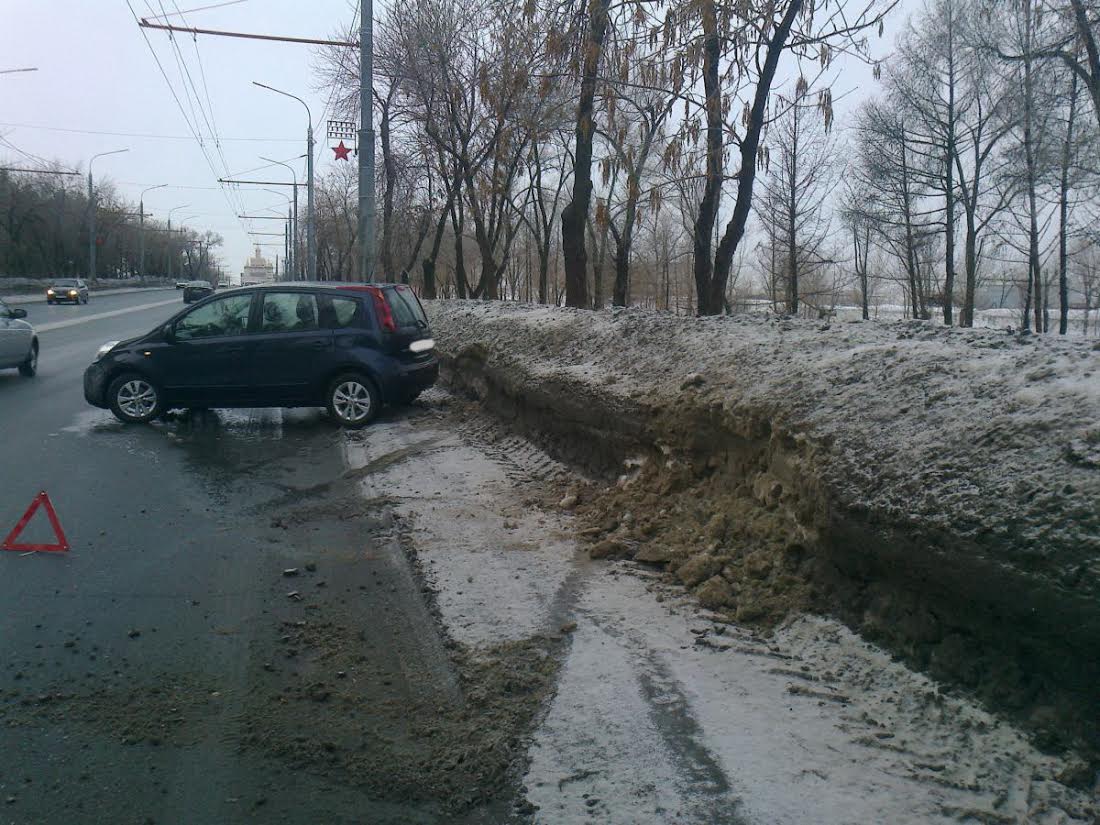 Сегодня в Оренбурге водитель автомобиля Nissan Note, двигаясь по пр. Победы, в сторону ул. Степана Разина не справился с управлением автомобиля на скользкой дороге и допустил наезд на снежный вал.