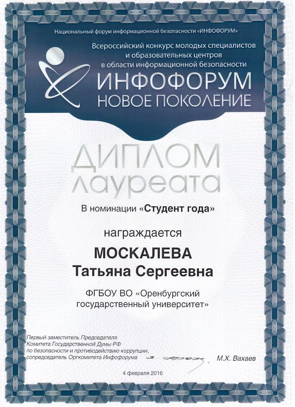 В ходе форума состоялось награждение лауреатов профессиональной премии в области информационной безопасности «Серебряный кинжал» и конкурса студентов, молодых специалистов и образовательных центров «Инфофорум – Новое поколение». 20 лучших студентов из всех регионов Российской Федерации, обучающихся по направлению «Информационная безопасность», прибыли в Москву, чтобы получить свои награды. В номинации «Студент года» победила Татьяна Москалева — студентка 4-го курса факультета математики и информационных технологий ОГУ (специальности «Компьютерная безопасность»).