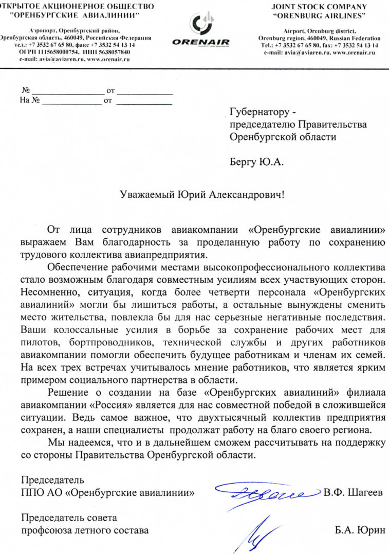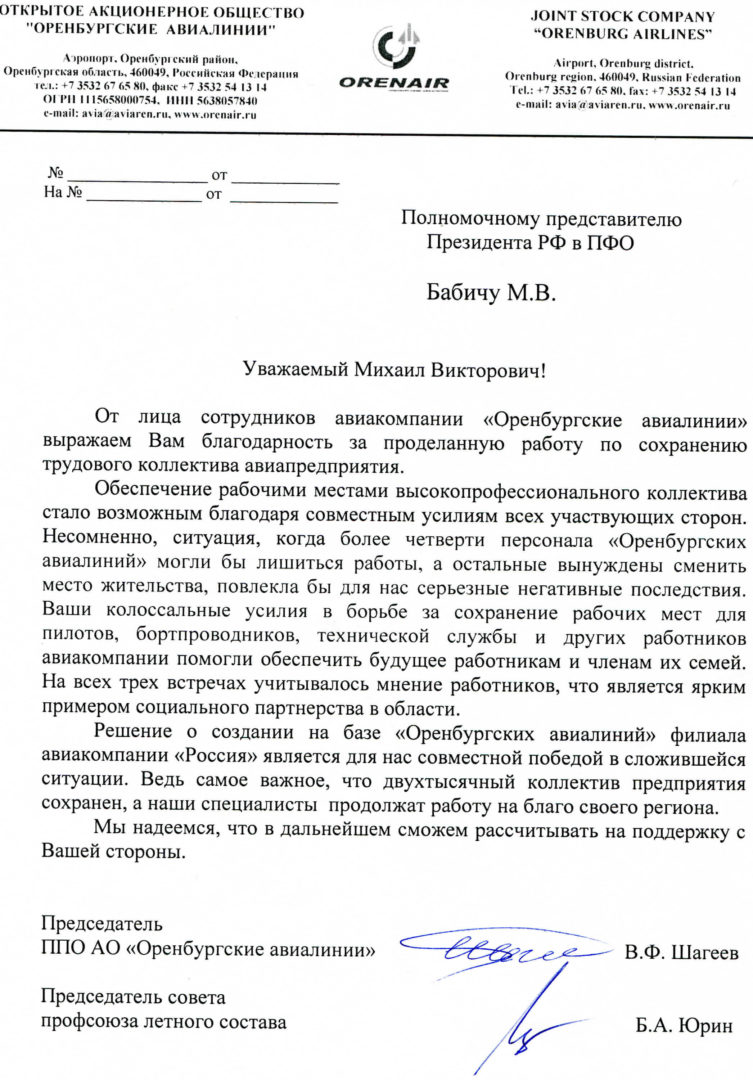 «Ситуация, когда более четверти персонала «Оренбургских авиалиний» могли лишиться работы, а остальные вынуждены сменить место жительства, повлекла бы для нас серьезные негативные последствия. — пишут в обращении профсоюзные лидеры АО «Оренбургские авиалинии» Вадим Шагеев и Борис Юрин, — Ваши колоссальные усилия в борьбе за сохранение рабочих мест для пилотов, бортпроводников, технической службы и других категорий помогли обеспечить будущее работникам и членам их семей».