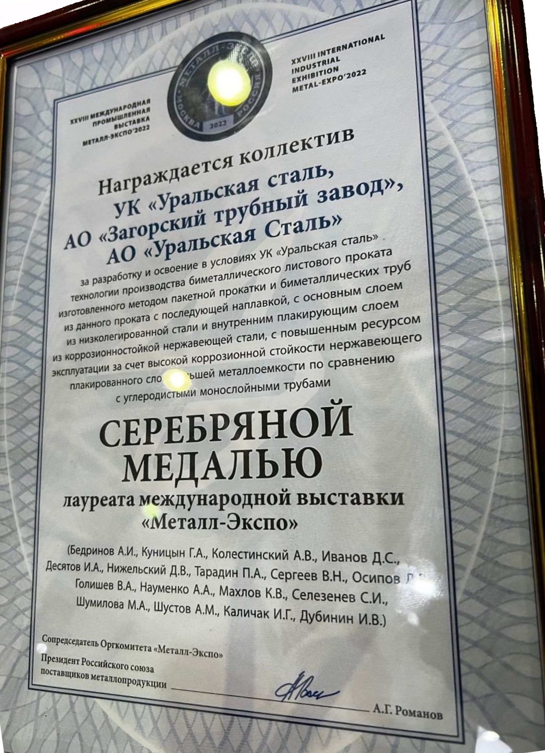 Коллектив управляющей компании «Уральская Сталь», комбината «Уральская Сталь» и Загорского трубного завода удостоен серебряной медали лауреата 28-ой Международной промышленной выставки «Металл-Экспо-2022».