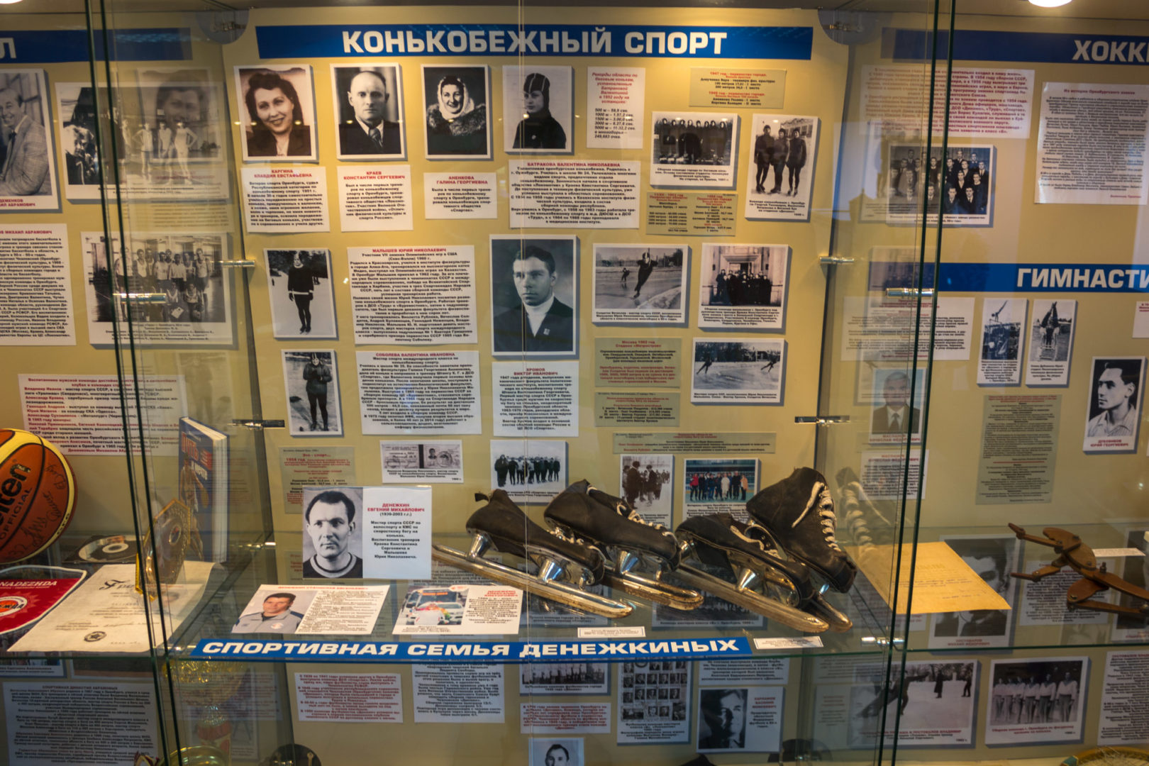 Экспозиция зала посвящена истории оренбургского физкультурно-спортивного движения и состоит из нескольких разделов, в том числе «Они стояли у истоков», «1941-1945 годы». На стендах, посвященных различным видам спорта, представлены биографии ветеранов, чемпионов, призеров разных лет. В выставочных витринах ‒ значки, кубки, медали прославленных спортсменов. В центре зала внимание посетителей привлекает итальянский велосипед Colnago на котором побеждал заслуженный мастер СССР, неоднократный чемпион СССР, победитель велогонки Мира Александр Михайлович Гусятников.