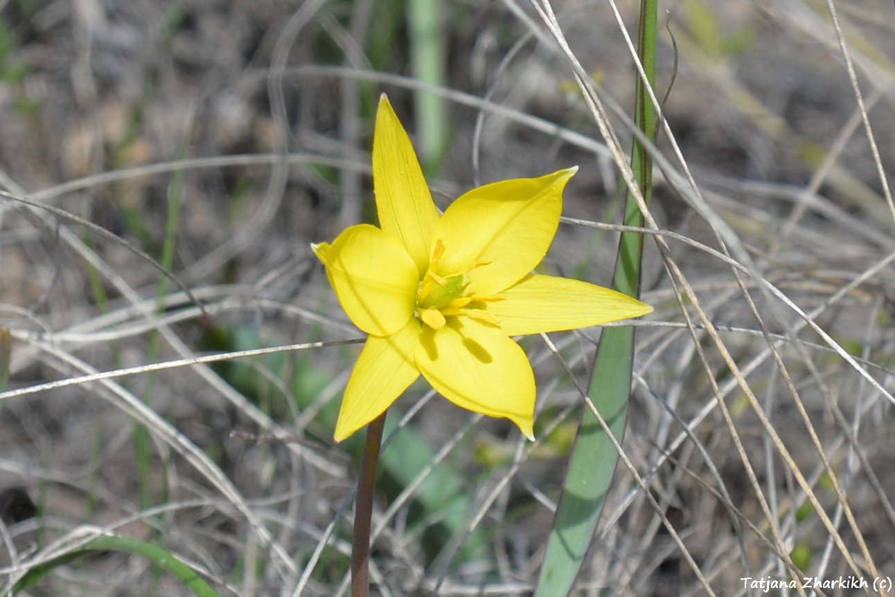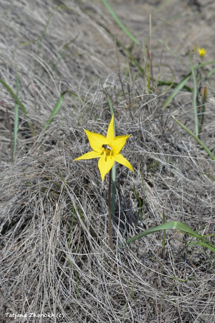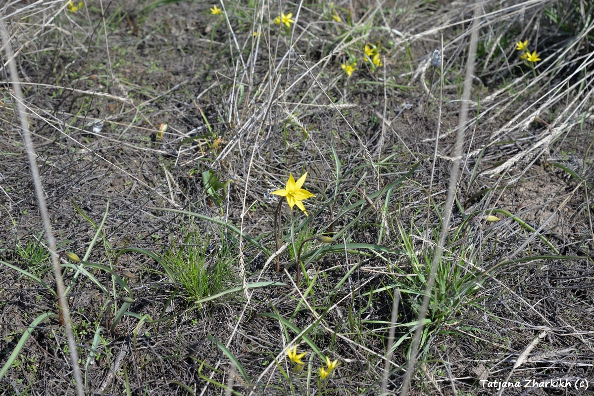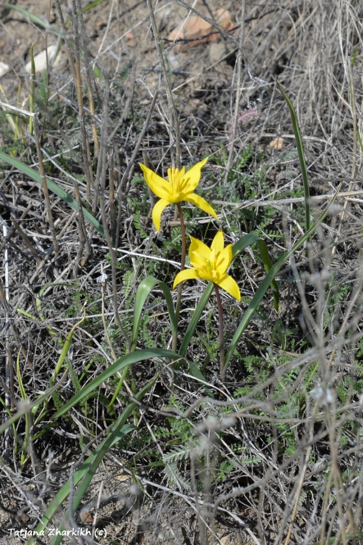 Зимой на нашем участке «Предуральская степь», слушая завывания метелей и наблюдая, как растут сугробы вокруг кордона, мы думали, что весна наступит поздно. Но сегодня, 13 апреля, у нас праздник – мы увидели первые тюльпаны. Первыми из рода Tulipa обычно расцветают нежные жёлтенькие тюльпаны Биберштейна – они маленькие, не выше 10 сантиметров и едва-едва поднимают головки над пожухлой степной растительностью. Но в этом году у нас одновременно с Биберштейна зацвёл и другой вид – тюльпан поникающий. На вершине водораздела между урочищами Колубай и Курсай мы нашли один единственный цветок с характерными бело-жёлтыми лепестками. Впрочем, другие степные первоцветы – гусиный лук и редкий адонис волжский – на два дня опередили цветение тюльпанов. Они тоже сияющего жёлтого цвета, но если скромные звёздочки гусиного лука можно увидеть вместе с тюльпанами, то адонисы цветут только в своей дружной компании.