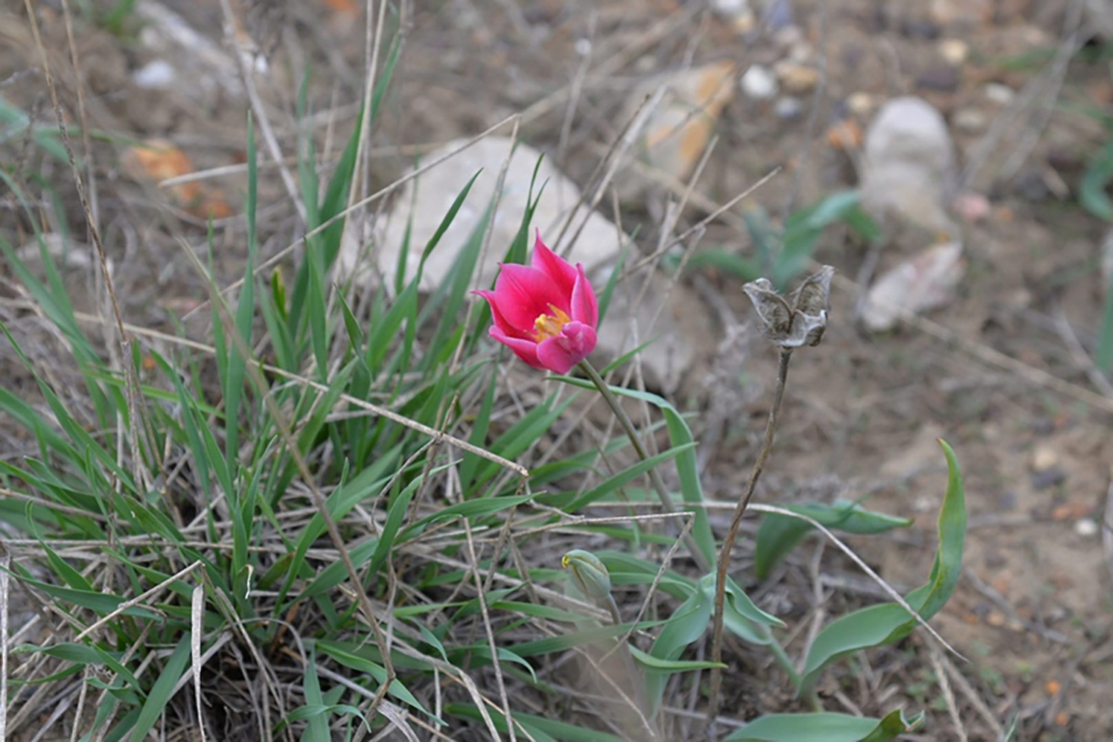 Участок «Предуральская степь». 11 апреля около кордона «Сармат» – цветущие гусиный лук и адонис волжский. Уже через два дня, 13 апреля, обнаружили в степи первые тюльпаны – это были жёлтые тюльпаны Биберштейна. В этот же день увидели ещё один вид – тюльпан поникающий, отличающийся от Биберштейна характерными бело-жёлтыми лепестками. Ещё через два дня, 15 апреля, наконец, появились нежёлтые первоцветы – распустились мохнатые колокольчики сон-травы, или, по-научному, прострела раскрытого. В этот же день расцвели лютики, вид лютик многокорневой. Тюльпаны Биберштейна тем временем заполнили всю степь. 15 и 17 апреля сотрудником научного отдела и госинспекторами было встречено ещё несколько видов птиц, не отмеченных во время орнитологических исследований, проходящих 11-14 апреля: ворон, большой кроншнеп, большая белая цапля и чомга. Удалось сфотографировать пару черношейных поганок. 17 апреля, ровно через неделю после появления первых цветов в Предуральской степи, на южном склоне урочища Колубай были найдены три разноцветных тюльпана Геснера (он же – тюльпан Шренка).